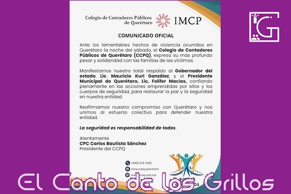 El Colegio de Contadores Públicos de Querétaro (CCPQ), se pronunció en contra de la violencia luego de los hechos ocurridos este sábado en Querétaro.