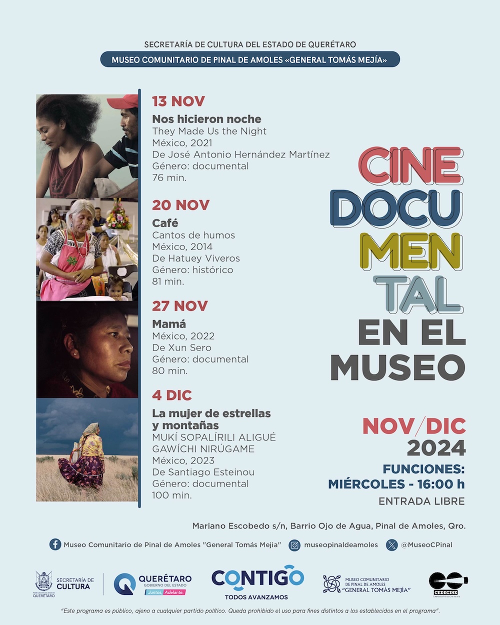 A partir de este miércoles 13 de noviembre, el Museo Comunitario de Pinal de Amoles “General Tomás Mejía”, de la Secretaría de Cultura del estado, será sede del Ciclo Cine Documental en el Museo, que incluye la proyección de cuatro interesantes largometrajes: “Nos hicieron noche”, “Café”, “Mamá”, “La mujer de estrellas y montañas”.