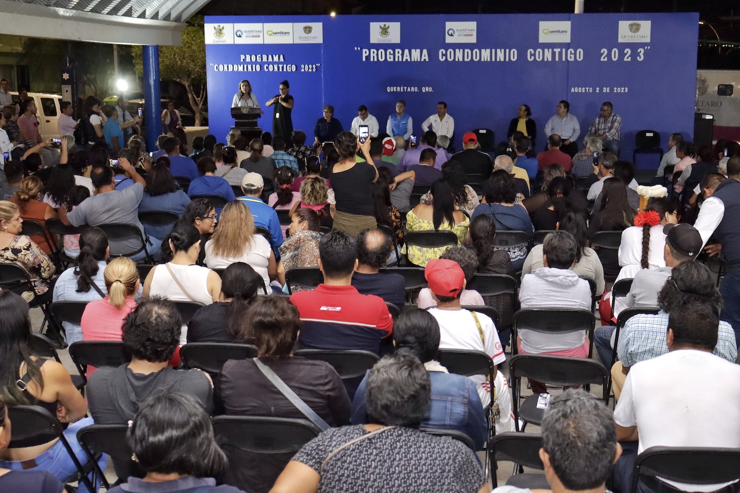 La secretaria de Gobierno, Guadalupe Murguía Gutiérrez, presentó a los habitantes de la delegación Félix Osores Sotomayor el programa “Condominio Contigo 2023”, el cual tiene como propósito que inscriban el acta de asamblea de condóminos en el Registro Público de la Propiedad del Estado donde se elija por primera vez o se actualice la mesa directiva. Además, el municipio de Querétaro anunció que se suma al programa con el apoyo de mil pesos adicionales a los condominios que califiquen.