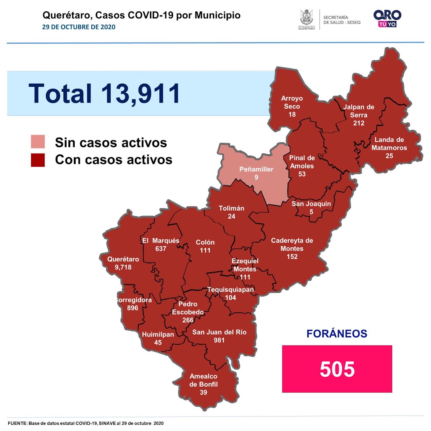 En Querétaro, un hombre de 48 años con hipertensión arterial, una mujer de 53 con hipertensión arterial e insuficiencia renal, un hombre de 57 con obesidad, un hombre de 59 y una mujer de 85 con enfermedad pulmonar obstructiva crónica, tres hombres uno de 64, uno de 68 y uno de 72 y una mujer de 74 con diabetes, dos mujeres una 68 y una de 82 con diabetes, hipertensión arterial y obesidad, un hombre de 80 con hipertensión arterial y cardiopatía, y un hombre de 91 años sin comorbilidad, que se encontraban hospitalizados, fallecieron a causa de la enfermedad Covid-19.