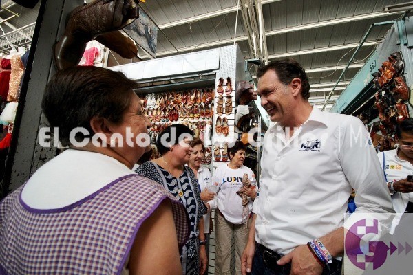 Los candidatos al Senado de la República, Mauricio Kuri González y Lupita Murguía Gutiérrez, de la coalición Por México al Frente, integrada por Acción Nacional, Partido de la Revolución Democrática y Movimiento Ciudadano, realizaron un recorrido por el mercado Escobedo y por calles del centro de la capital queretana.