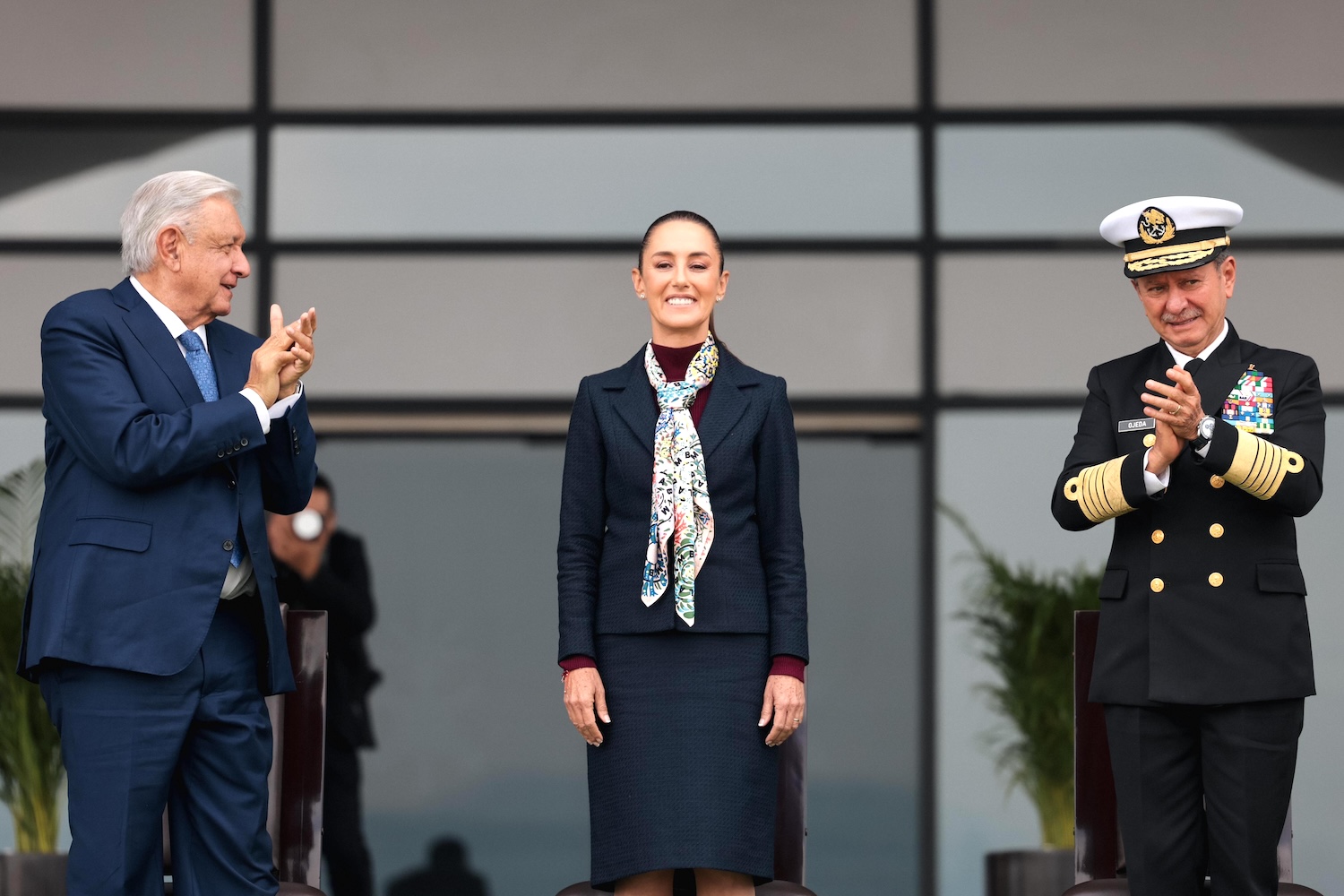 Por su parte, el presidente Andrés Manuel López Obrador, celebró el proceso de transición armonioso y se dijo contento de entregar la Banda Presidencial a una mujer como Claudia Sheinbaum; al mismo tiempo que aprovechó para felicitar a los próximos titulares de la Secretaría de la Defensa Nacional (Sedena) y la Secretaría de Marina (Semar), por sus nombramientos.
