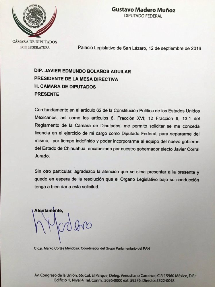 Gustavo Madero presenta este lunes una solicitud de licencia como Diputado federal para incorporarse al equipo de gobierno de Javier Corral en Chihuahua.