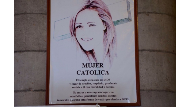 “Mujer católica: El templo es la casa de DIOS (sic) y lugar de oración, respétalo, preséntate vestida a él con moralidad y decoro. No entres a este sagrado lugar con minifaldas, pantalones ceñidos, escotes inmorales o alguna otra forma de vestir que ofenda a DIOS (sic)”.