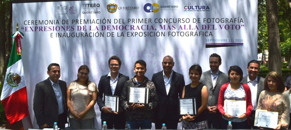Los titulares del Instituto Electoral del Estado de Querétaro (IEEQ), el Tribunal Electoral del Estado de Querétaro (TEEQ) y la Presidencia Municipal de Querétaro, encabezaron la ceremonia de premiación e inauguración de la exposición del Primer Concurso de Fotografía ‘Expresiones de la democracia, más allá del voto’, en la Alameda Hidalgo de esta ciudad.