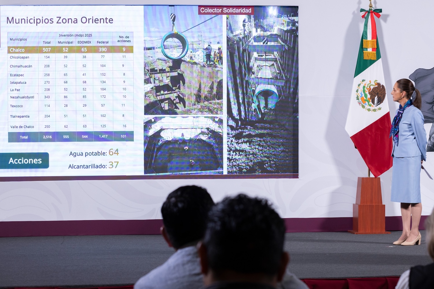 - Apoyo a 10 municipios de la zona oriente del Estado de México: en beneficio de 6.4 millones de personas se contempla una inversión en 2025 de 2 mil 516 mdp: 555 mdp será de recursos municipales; 544 mdp estatales y mil 417 federales. Se encuentran en proceso 101 acciones: 64 de agua potable y 37 de alcantarillado.