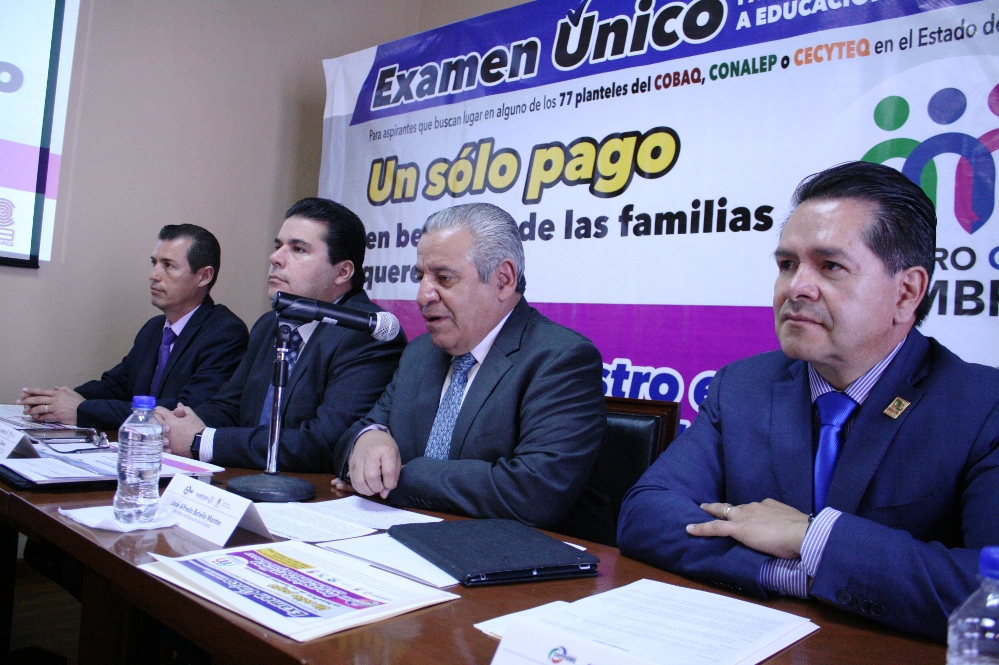 En las instalaciones de la Secretaría de Educación del Estado de Querétaro (Sedeq) se realizó esta mañana una rueda de prensa en la que el titular de la dependencia, José Alfredo Botello Montes, acompañado por el coordinador ejecutivo del Consejo Estatal para la Planeación y Programación de la Educación Media y Superior (CEPPEMS) y el director general del Colegio de Bachilleres del Estado de Querétaro (Cobaq), Arturo Molina Zamora, anunció una estrategia denominada Examen Único en la que participan tres instituciones del estado: Cobaq, Colegio Nacional de Educación Profesional Técnica (Conalep) y Colegio de Estudios Científicos y Tecnológicos del Estado de Querétaro (CECYTEQ), cuyo propósito es ofrecer una mejora del proceso de captación a quienes aspiran a ingresar al primer semestre en un Plantel de bachillerato público.