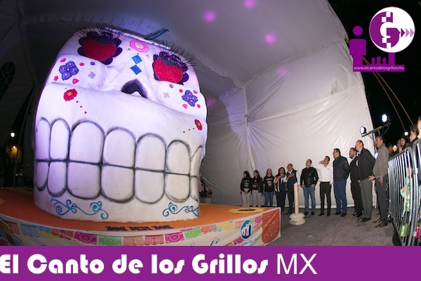El alcalde de San Juan del Río, Memo Vega, acompañado por directivos del Instituto Coledi, presentó a "Cathy", la calavera de azúcar más grande del mundo, que mide 5 metros con 20 centímetros y pesa cerca de una tonelada y media.