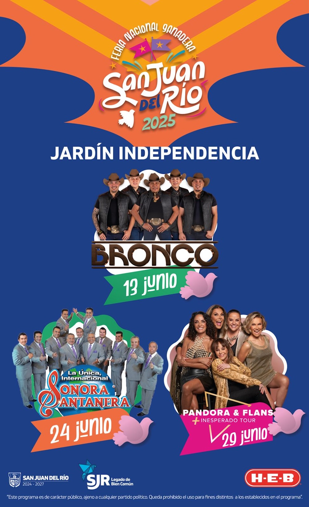 Como parte de las actividades de la Feria Nacional Ganadera San Juan del Río 2025, la Plaza Independencia será sede de la presentación de Bronco, el 13 de junio; de La Única Internacional Sonora Santanera, el 24 de junio, fecha en que se coronará a Hanney I como Reina de la Feria, así como de Pandora y Flans, el 29 de junio. En tanto, en el Palenque del Centro Expositor se presentarán Edén Muñoz, el 13 de junio; Julión Álvarez, el 14; La Arrolladora, el 21, y Christian Nodal el 28 de junio.