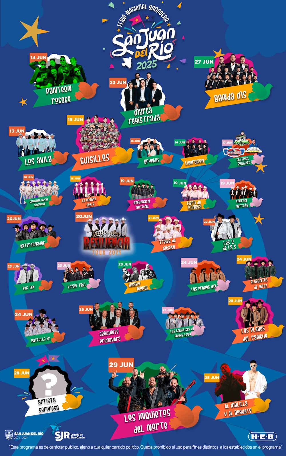 En el Teatro del Pueblo se presentarán, el 13 de junio, Los Ávila; el 14, Panteón Rococó; el 15, Cuisillos; el 16, Bryndis y Liberación; el 17, Festival Sonidero; el 18, Conjunto Amanecer y Kumbre con K; el 19, Maquinaria Norteña, Fiera de Ojinaga y Energía Norteña; el 20, Exterminador y Cardenales de Nuevo León; el 21, Trono de México; el 22, Marca Registrada y Los 2 de la S; el 23, Tex-Tex, Lira’n Roll y Heavy Nopal; el 24, Los Primos MX, Patrulla 81 y Elegantes de Jerez; el 25, El Malilla y El Bogueto; el 26, Conjunto Primavera; el 27, Los Cómplices de Nuevo León; el 28, Los Plebes del Rancho y un artista sorpresa, y el 29, Los Inquietos del Norte.