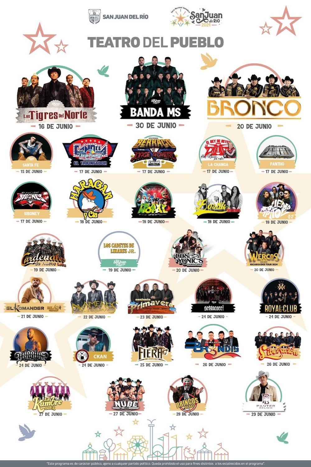 En el Teatro del Pueblo se presentarán artistas como, Los Tigres del Norte, Bronco, Banda MS, Los Cardenales de Nuevo León, Conjunto Primavera, Brindys, Liberación, El Komamder, entre otros. Mientras tanto, en el Jardín Independencia estarán presentes, Los Ángeles Azules, Napoleón, Ángeles Negros, Los Terrícolas, entre otros.