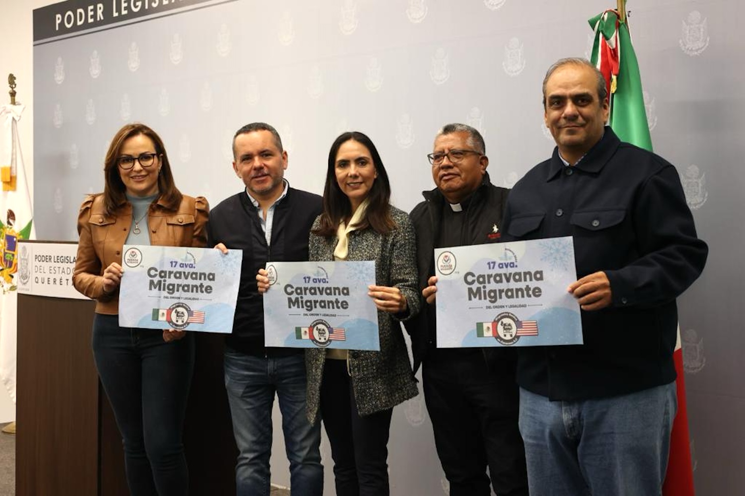 El presidente de la Mesa Directiva, Luis Gerardo Ángeles Herrera, las diputadas Liz Selene Salazar Pérez y Leticia Rubio Montes, el presidente y secretario de la Asociación Civil Migrantes Unidos en Caravana, Fernando Rocha Mier y el padre Aristeo Olvera, respectivamente, dieron a conocer los pormenores de la 17ª Caravana del Migrante 2023, que saldrá de Laredo, Texas, el próximo 19 de diciembre.