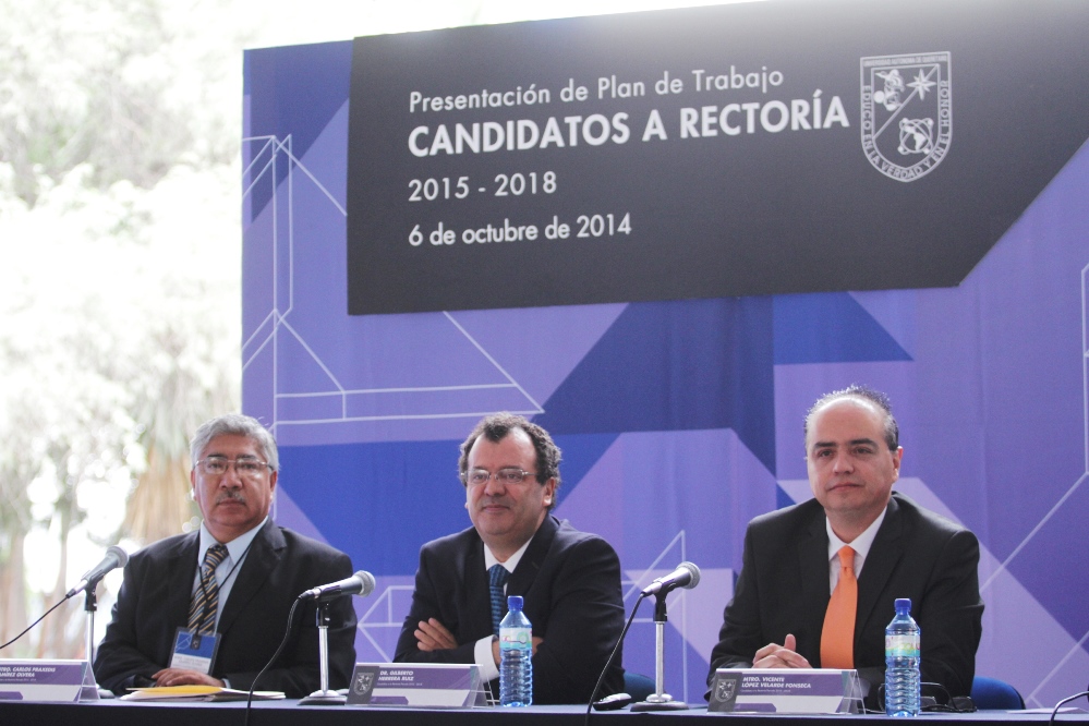 El Mtro. Carlos Praxedis Ramírez Olvera inició con la presentación, seguido por el Dr. Gilberto Herrera Ruiz y el Mtro. Vicente López Velarde Fonseca; cada uno expuso sus propuestas y proyectos de trabajo. Posteriormente, cada candidato contestó dos preguntas que la comunidad les formuló de manera individual y dos que fueron realizadas para que las respondieran los tres.