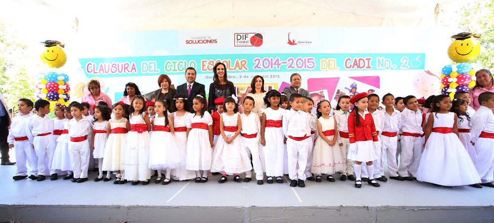 La Presidenta del Patronato del Sistema Estatal DIF, Sandra Albarrán de Calzada, encabezó una emotiva ceremonia para clausurar el ciclo 2014-2015 del Preescolar del Centro Asistencial de Desarrollo Infantil (CADI) No. 2, que atiende a hijos de madres trabajadoras o familias en situación de vulnerabilidad.
