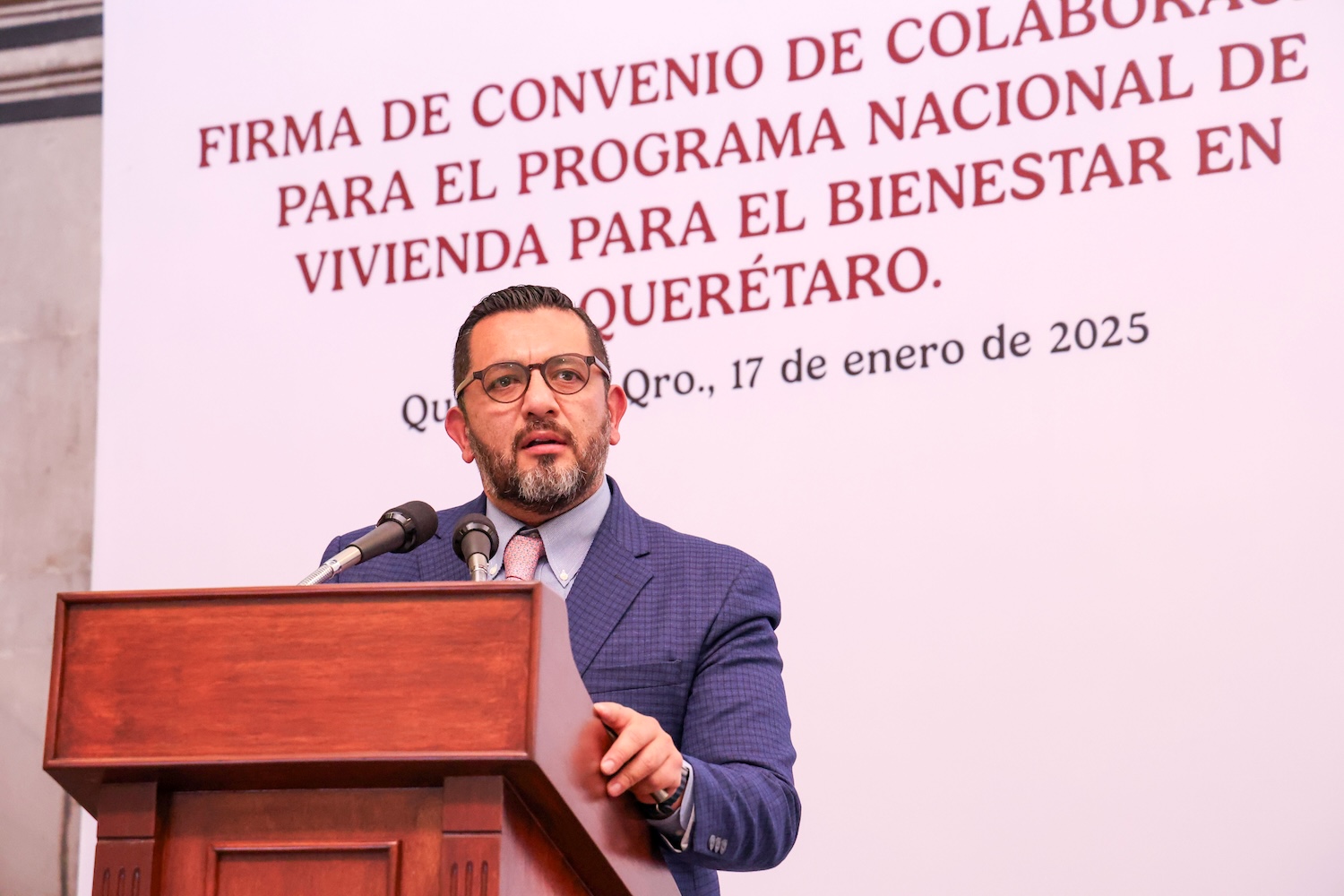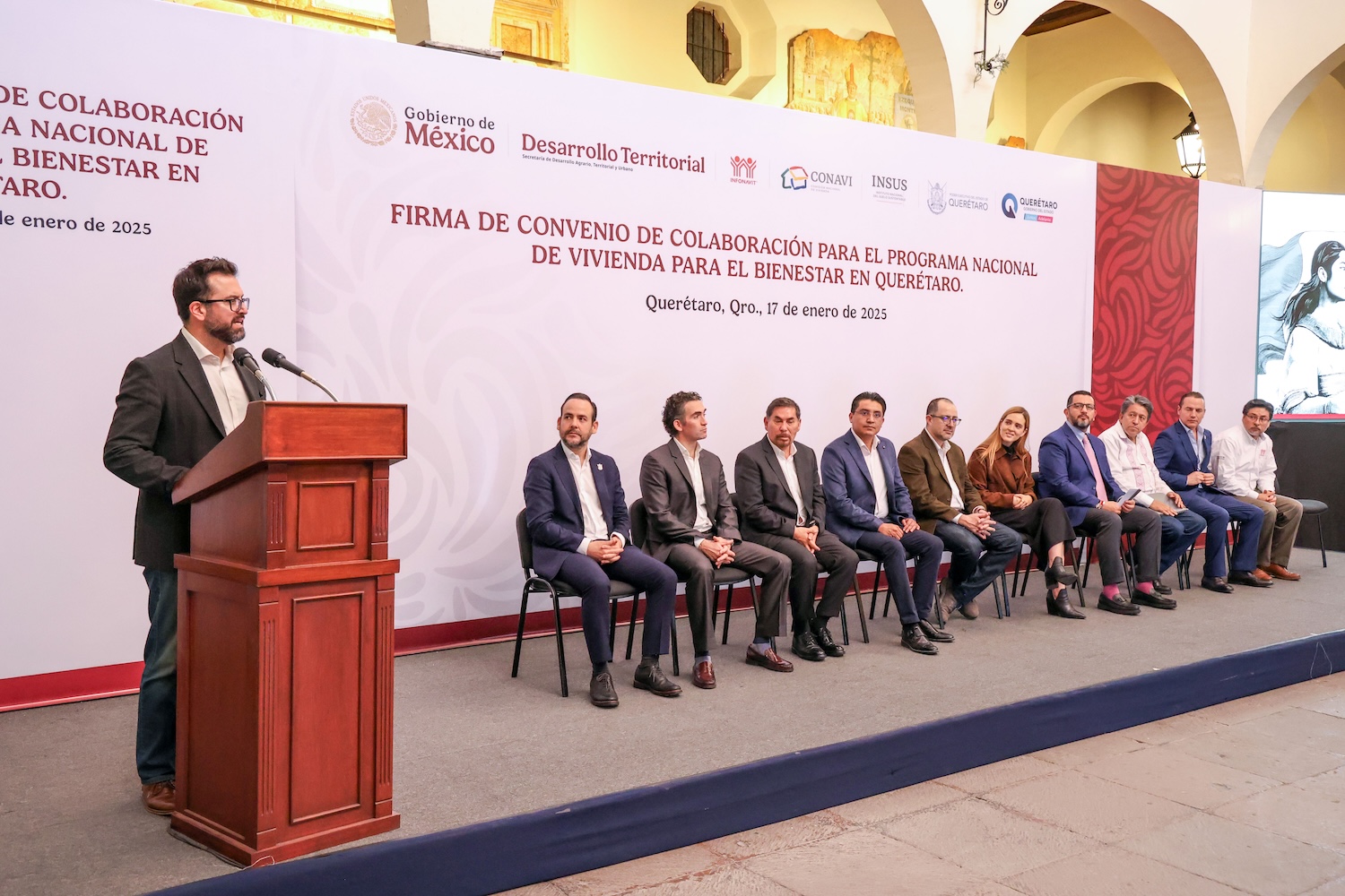 El secretario de Gobierno, Carlos Alberto Alcaraz Gutiérrez, encabezó, junto a la secretaria de la Juventud, Virginia Hernández Vázquez, la firma del Convenio de Colaboración para la implementación del Programa Nacional de Vivienda para el Bienestar en Querétaro que impulsa el gobierno federal y con el que se prevé construir 16 mil viviendas en la entidad.