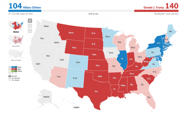 De los 270 votos necesarios para ganar la elección presidencial, la cadena Fox da una ventaja a Donald Trump de 150 votos sobre 122 de Clinton mientras que el New York Times lo ubica con 137 sobre 104. En el conteo de CNN, el magnate neoyorkino obtiene 139 mientras que la ex secretaria de Estado obtiene 104.