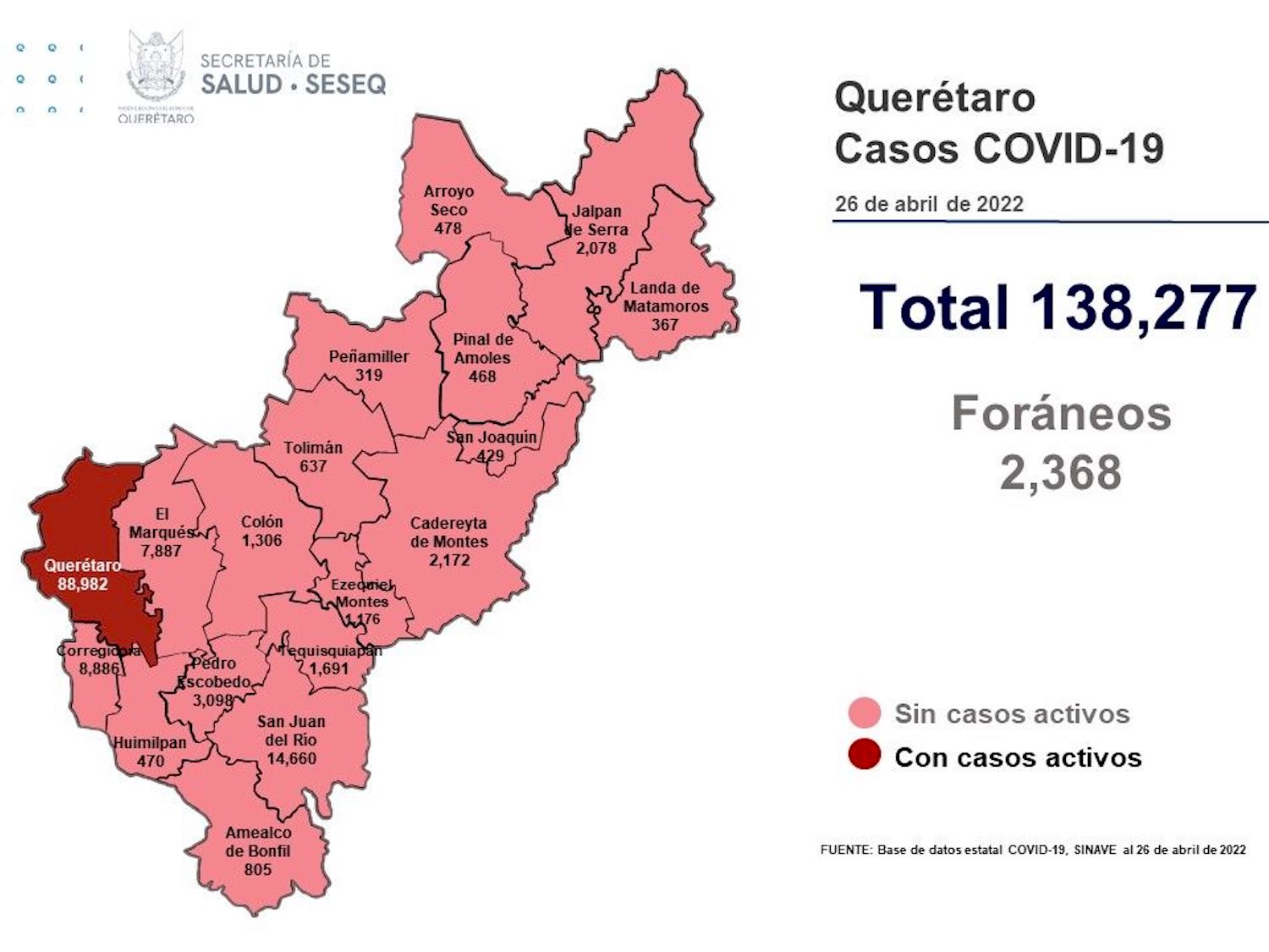 La Secretaría de Salud de Querétaro reportó este martes cero defunciones por Covid-19, aunque se sumaron tres casos de la enfermedad; se trata de dos mujeres y un hombre. El registro acumulado es de 138 mil 277 casos; 52% son mujeres y 48% son hombres.