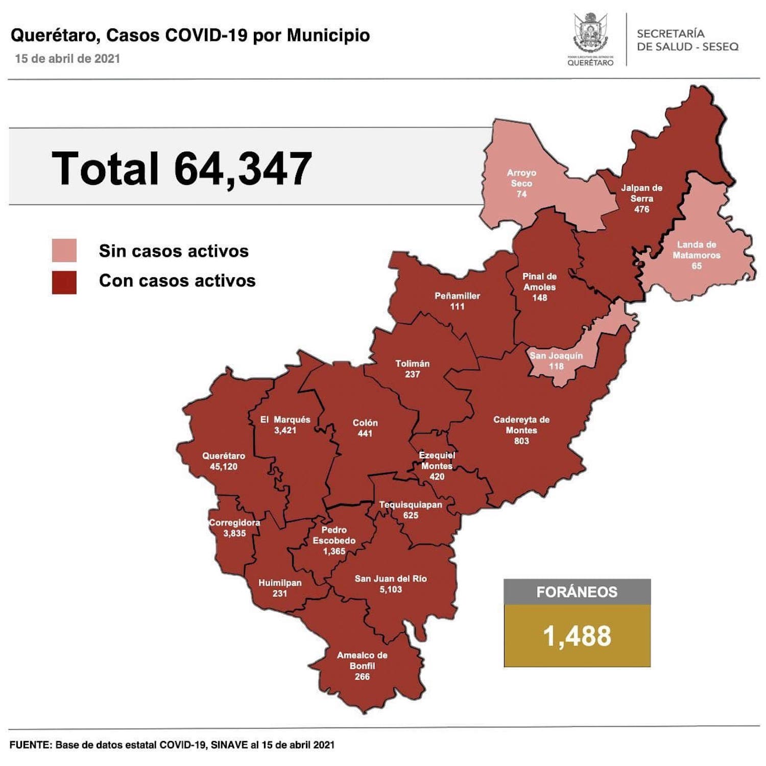 En Querétaro, dos hombres, de 46 y 62 años, sin comorbilidad, así como cuatro mujeres –de 51, 64, 65 y 78– y un hombre de 80 años, con diversas comorbilidades, que se encontraban hospitalizados, fallecieron a causa de Covid-19.