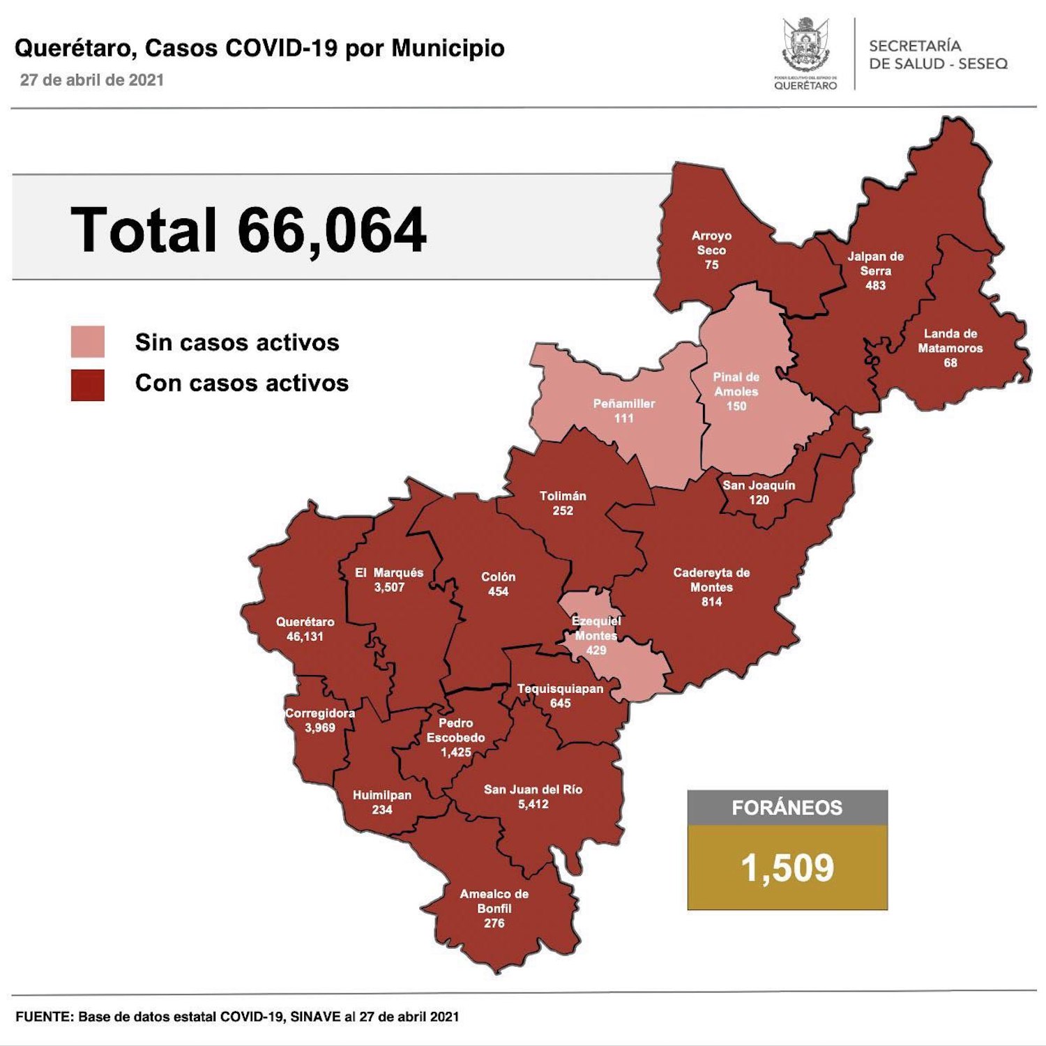El registro acumulado es de 66 mil 64 casos de Covid-19; 51% son mujeres y 49% son hombres.