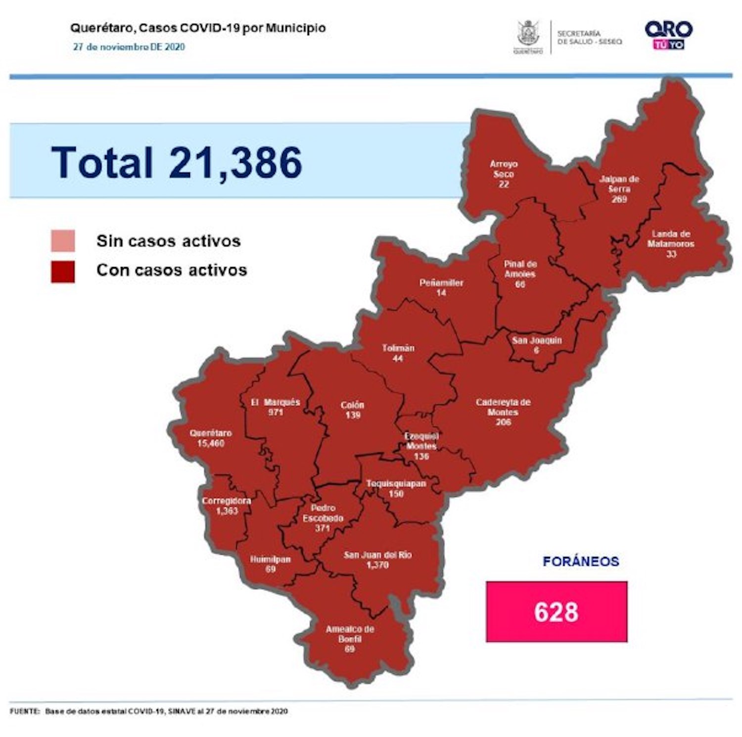En Querétaro, una mujer de 52 y tres hombres —dos de 60 y uno de 72 años— sin comorbilidad, dos mujeres —una de 57 y una de 66 y un hombre de 86— con diabetes e hipertensión arterial, una mujer de 59 con diabetes, dos hombres —uno de 71 y uno de 72— con hipertensión arterial y una mujer de 88 años con hipertensión arterial y cardiopatía, que se encontraban hospitalizados, fallecieron a causa de Covid-19.