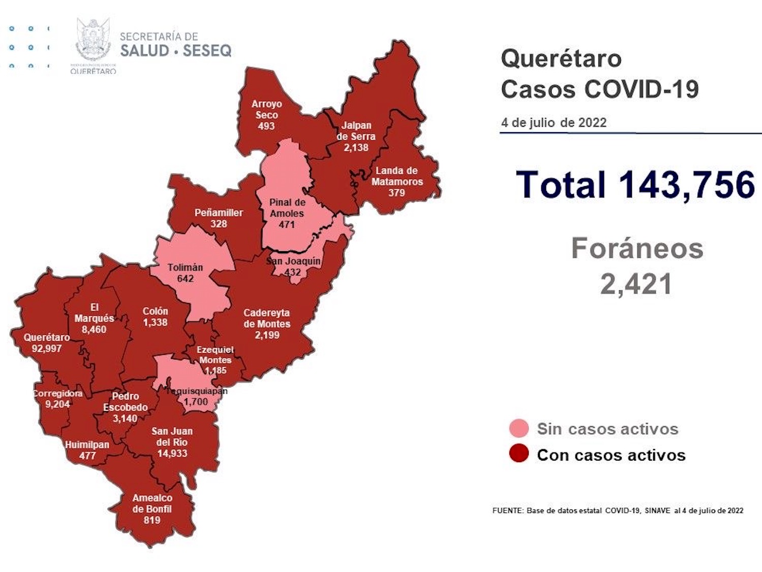 La Secretaría de Salud de Querétaro reportó este lunes cero defunciones por Covid-19 y que en los últimos tres días se han sumado 253 casos de la enfermedad en el estado (el sábado se reportaron 61 casos, el domingo se registró uno y este lunes 191), se trata de 145 mujeres y 108 hombres. El registro acumulado es de 143 mil 756 casos; 52% son mujeres y 48% son hombres.