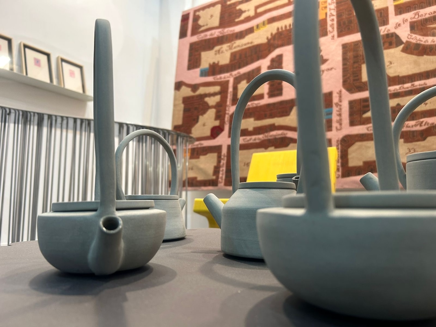 Se exhibe también la colección de teteras de barro Kind Voids, elaboradas en colores gris y marfil por la diseñadora zacatecana Lucila Rodarte, las cuales remiten a los materiales térreos y al trabajo hecho a mano. De igual forma, desde la perspectiva del trabajo en barro con técnicas vernáculas oaxaqueñas, se muestra la colección Mitades de la serie Open Fires, diseñada por Liliana Ovalle y desarrollada en colaboración con Mujeres del Barro Rojo y Colectivo 1050º.
