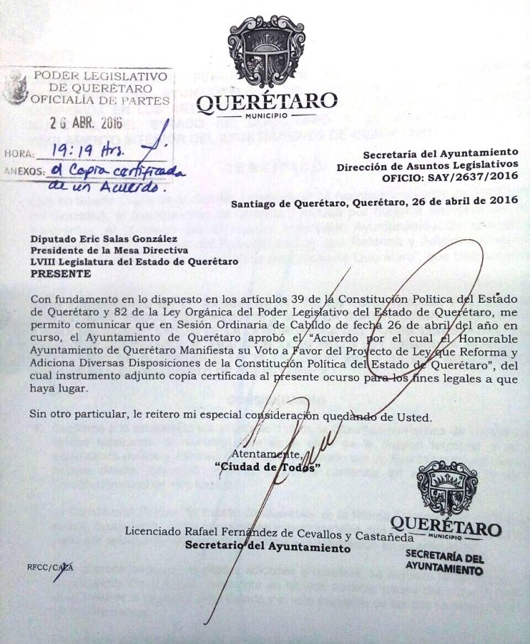 El Ayuntamiento de Querétaro es el primer municipio del estado que aprueba la Reforma Constitucional que fue aprobada este martes por los diputados de la LVIII Legislatura, informó el presidente del Congreso local, Éric Salas González.