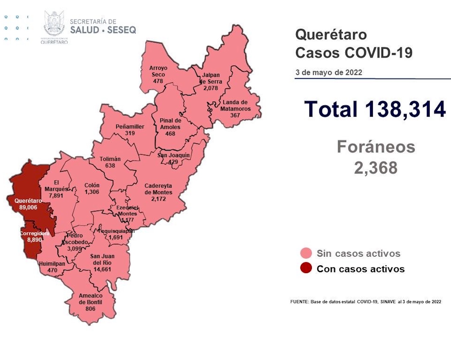 La Secretaría de Salud de Querétaro reportó este martes cero defunciones por Covid-19, aunque se sumaron tres casos de la enfermedad; se trata de tres hombres. El registro acumulado es de 138 mil 314 casos; 52% son mujeres y 48% son hombres.