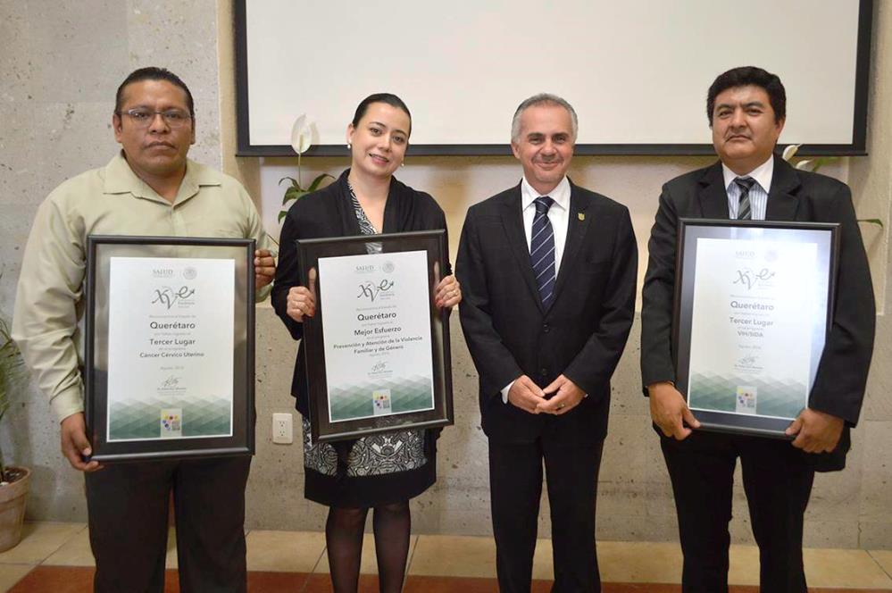 Detalló que durante el Encuentro Nacional de Prevención y Promoción de la Salud que se llevó a cabo en el mes de agosto del presente año, se dieron a conocer las entidades federativas que obtuvieron los tres primeros lugares en los índices de desempeño al cierre de 2015, siendo el estado de Querétaro el merecedor de los siguientes reconocimientos:
