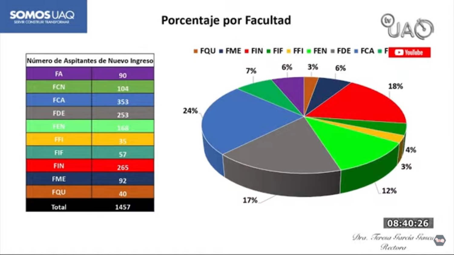 “Aunque las mujeres tienen un menor porcentaje de éxito para ingresar a la universidad, en realidad tenemos más mujeres aspirantes que ingresan a la UAQ, esto lo que nos está diciendo es que tenemos un gran número de mujeres luchando por entrar a la Universidad. El total es de 57 por ciento de mujeres y 43 por ciento de hombres”, añadió.