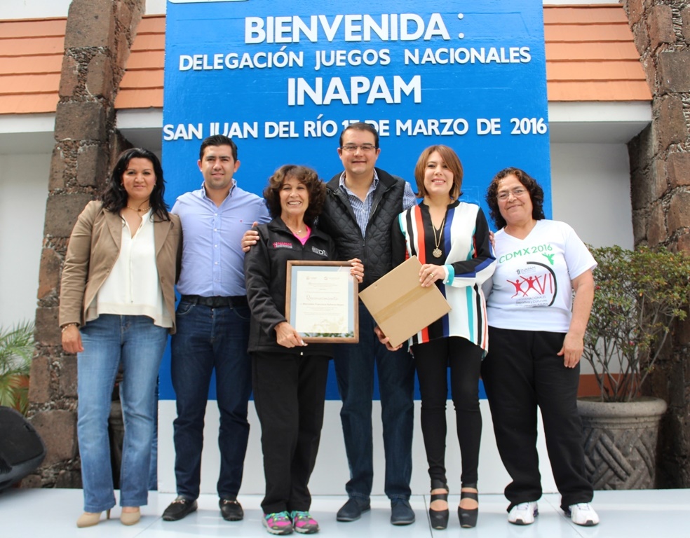 Acompañado de su esposa Male Ruiz, el alcalde Memo Vega entregó reconocimientos especiales a los ganadores en diferentes disciplinas, que representaron a San Juan del Río en los XXVI Juegos Nacionales Deportivos y Culturales del Instituto Nacional de las Personas Adultas Mayores (INAPAM).