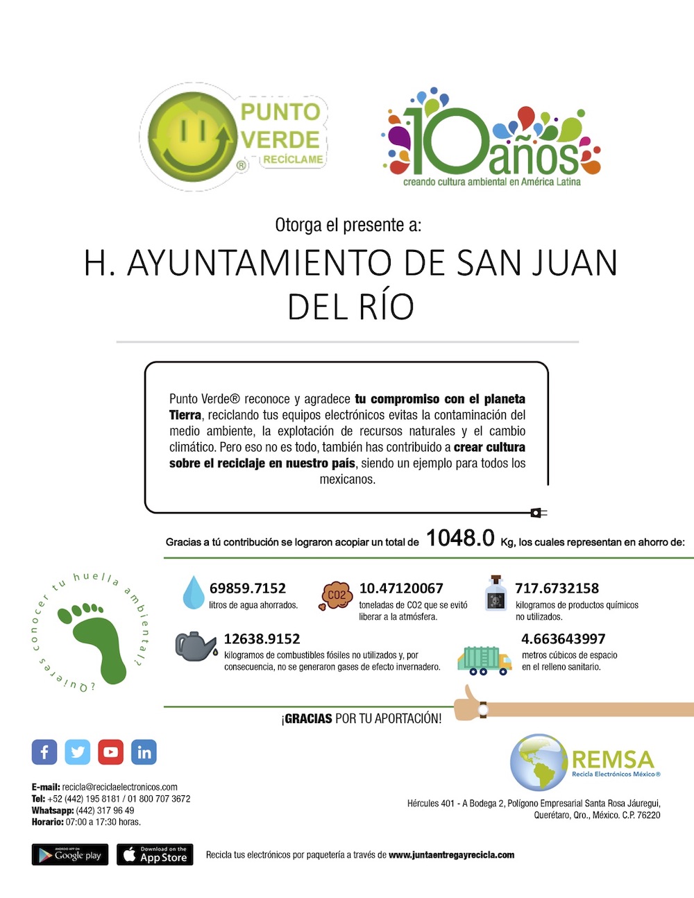 La Asociación Civil “Punto Verde” otorgó un reconocimiento al gobierno de San Juan del Río, que encabeza el alcalde Memo Vega, por su compromiso con el planeta, al realizar la Campaña de Reciclaje de Residuos Electrónicos, en la que se recabó más de una tonelada de estos artículos en desuso.