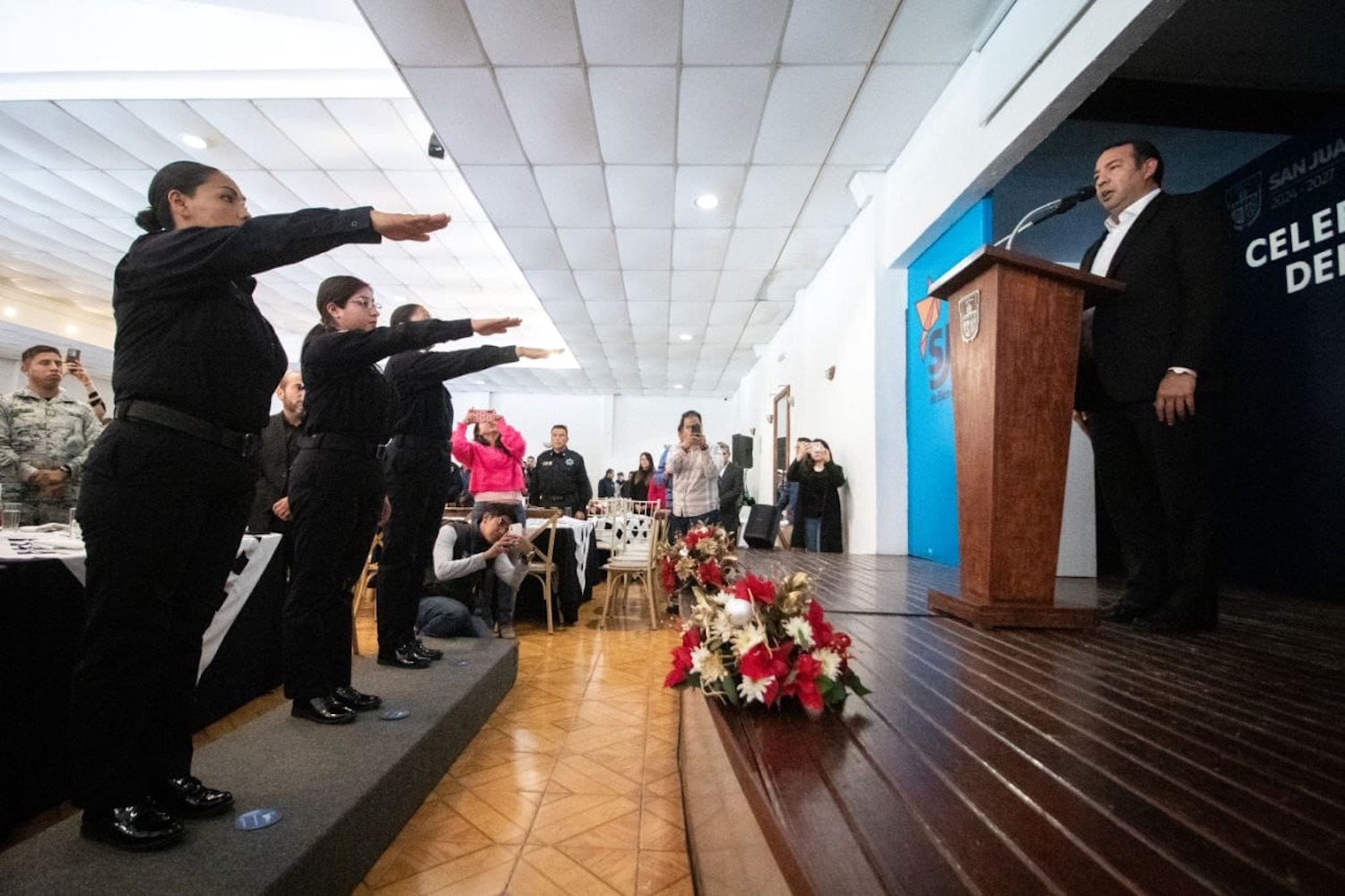 El presidente municipal de San Juan del Río les tomó protesta a Ana Paola Verde Camacho, María Josefina Mancilla Sibaja, Adriana Vega Sampayo, como policías de la 12ª generación. Asimismo, entregó reconocimientos al valor a los policías Víctor Manuel Escobar Presa, Florencia Hernández Ramírez, Nancy Garrido Pérez, Manuel Alejandro Septién Trujillo, Diana Estefany Romualdo Cruz y Esteban Torres Gallegos