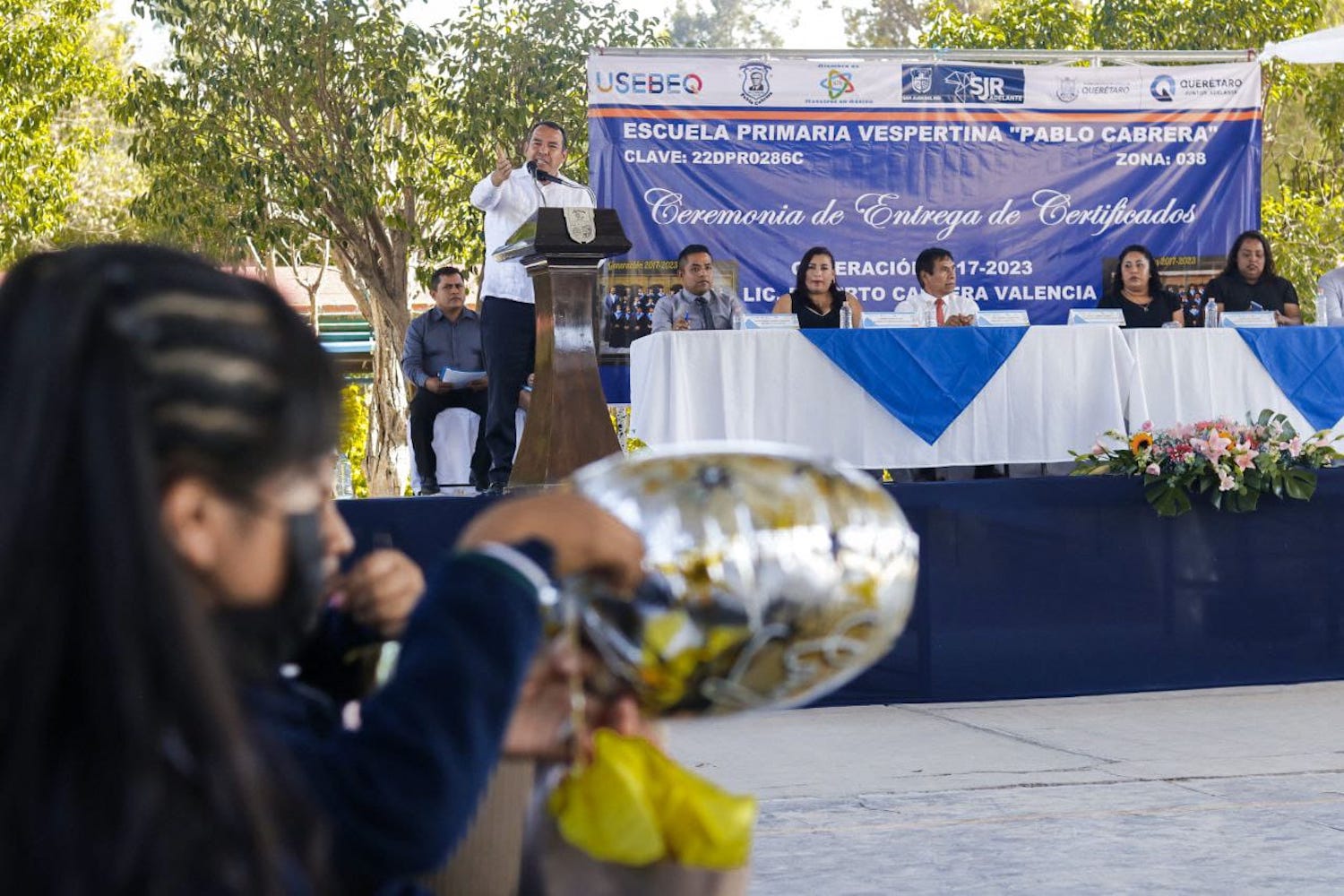 El presidente municipal de San Juan del Río, Roberto Cabrera Valencia, asistió a la ceremonia de entrega de certificados a la generación 2017-2023 de la escuela primaria vespertina Pablo Cabrera, ubicada en la comunidad de La Llave, donde recibió un reconocimiento de la Organización Internacional Maestros en Acción por su labor al frente de la presidencia municipal de San Juan del Río.