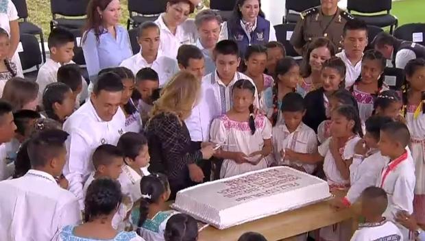 El presidente aprovechó el evento para felicitar a los niños de forma anticipada, partió un pastel y entregó regalos con motivo de su día el domingo próximo, para después develar la placa inaugural de las instalaciones, junto con el gobernador de la entidad, Omar Fayad.
