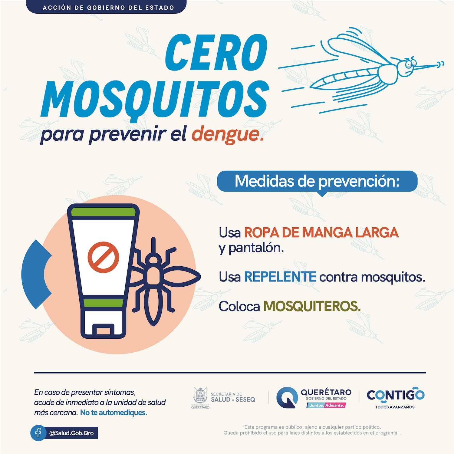 La Secretaría de Salud (Sesa) del estado de Querétaro, exhorta a la población a adoptar y reforzar las medidas preventivas ante el incremento en el número de casos de dengue en México. Es fundamental eliminar todo tipo de criaderos de mosquitos, protegerse de las picaduras y solicitar atención médica oportuna en caso de presentar síntomas.