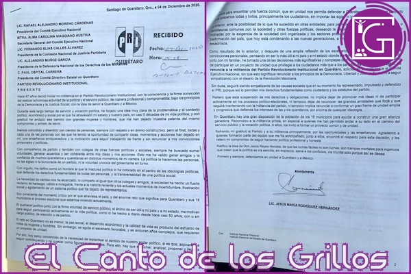 Después de 47 años de militancia, el expresidente municipal de Querétaro, Jesús Rodríguez Hernández, mejor conocido como “Chucho Rodríguez”, presentó su carta de renuncia al Partido Revolucionario Institucional (PRI).
