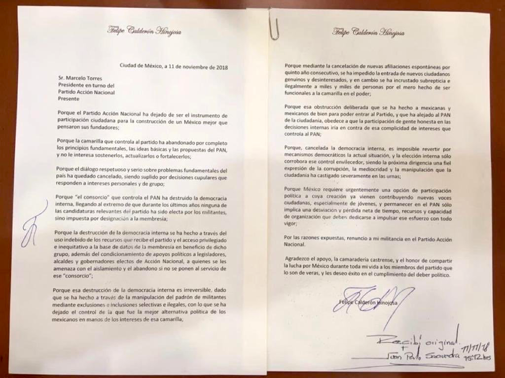 El expresidente de México, Felipe Calderón renunció a su militancia en el Partido Acción Nacional (PAN) este domingo, luego de asistir a votar en la elección donde Manuel Gómez Morín y Marko Cortés disputan la presidencia nacional del blanquiazul.