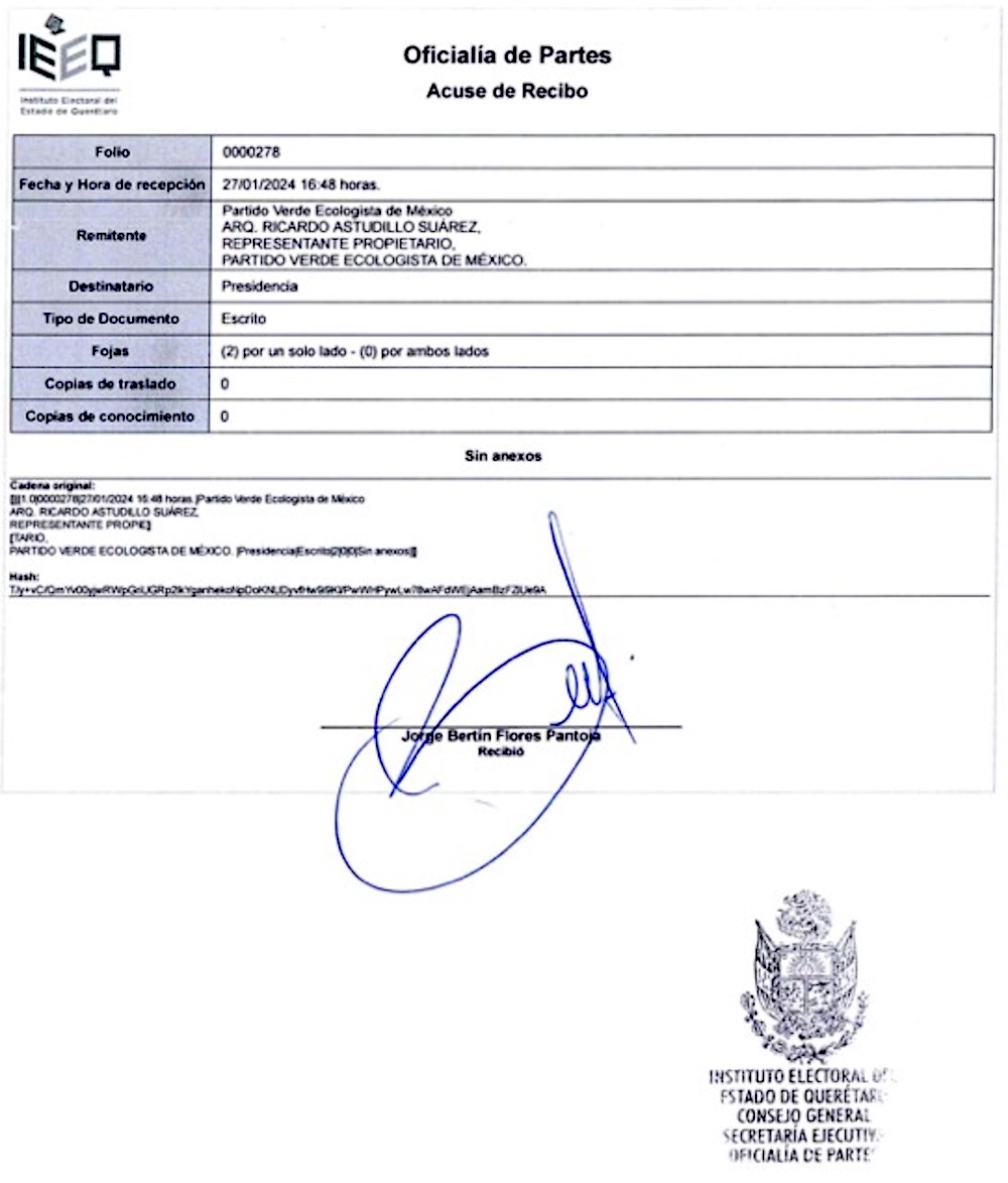 Por ello, expuso el dirigente estatal, “hemos solicitado al organismo electoral que se nos tenga por desistidos del acto de presentación del Convenio de Coalición, recibido en la Oficialía de Partes, suscrito por los Institutos Políticos: Verde Ecologista de México, MORENA y del Trabajo, en términos del Calendario Electoral Local, aprobado por este Instituto Electoral del Estado de Querétaro”.