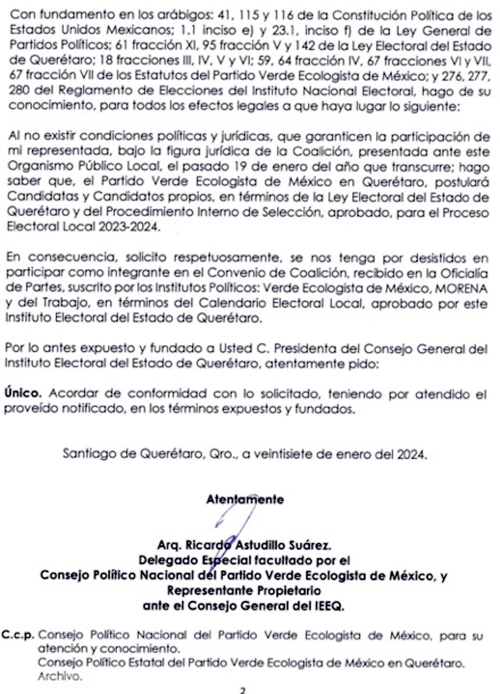 Señaló que al no existir las condiciones políticas y jurídicas que garanticen la participación política de este partido bajo la figura jurídica de la coalición, presentada ante el Instituto Electoral del Estado de Querétaro (IEEQ) el pasado 19 de enero, hizo saber a este instituto electoral que el Partido Verde Ecologista de México en Querétaro postulará candidatas y candidatos propios, en términos de la Ley Electoral del Estado de Querétaro y del Procedimiento Interno de Selección, aprobado para el Proceso Electoral Local 2023-2024.