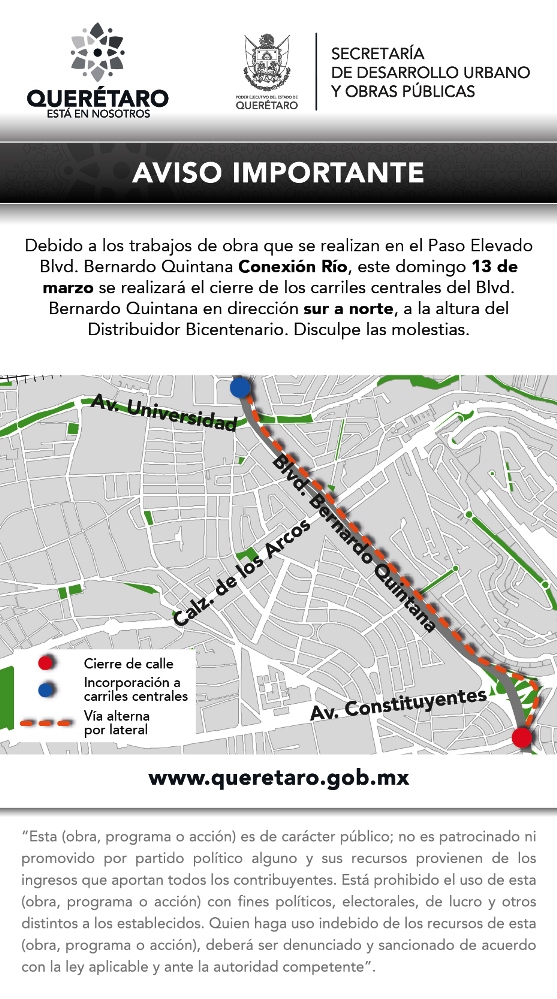 Debido a los trabajos de la obra Paso Elevado Blvd. Bernardo Quintana Conexión Río, la Secretaría de Desarrollo Urbano y Obras Públicas (SDUOP) del estado informa a la ciudadanía que este domingo 13 de marzo se mantendrá cerrada la circulación de los carriles centrales del boulevard Bernardo Quintana en dirección sur a norte.