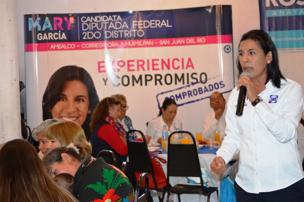 La candidata al Distrito II Federal por el Partido Acción Nacional, Mary García Pérez, acudió a un encuentro con más de 300 mujeres líderes de diferentes comunidades del Municipio de Amealco, donde expuso sus propuestas para este sector de la población y las invitó a luchar por sus derechos y a ser más partícipes de la vida política para convertirse en el detonante mayor de la población en sus comunidades.