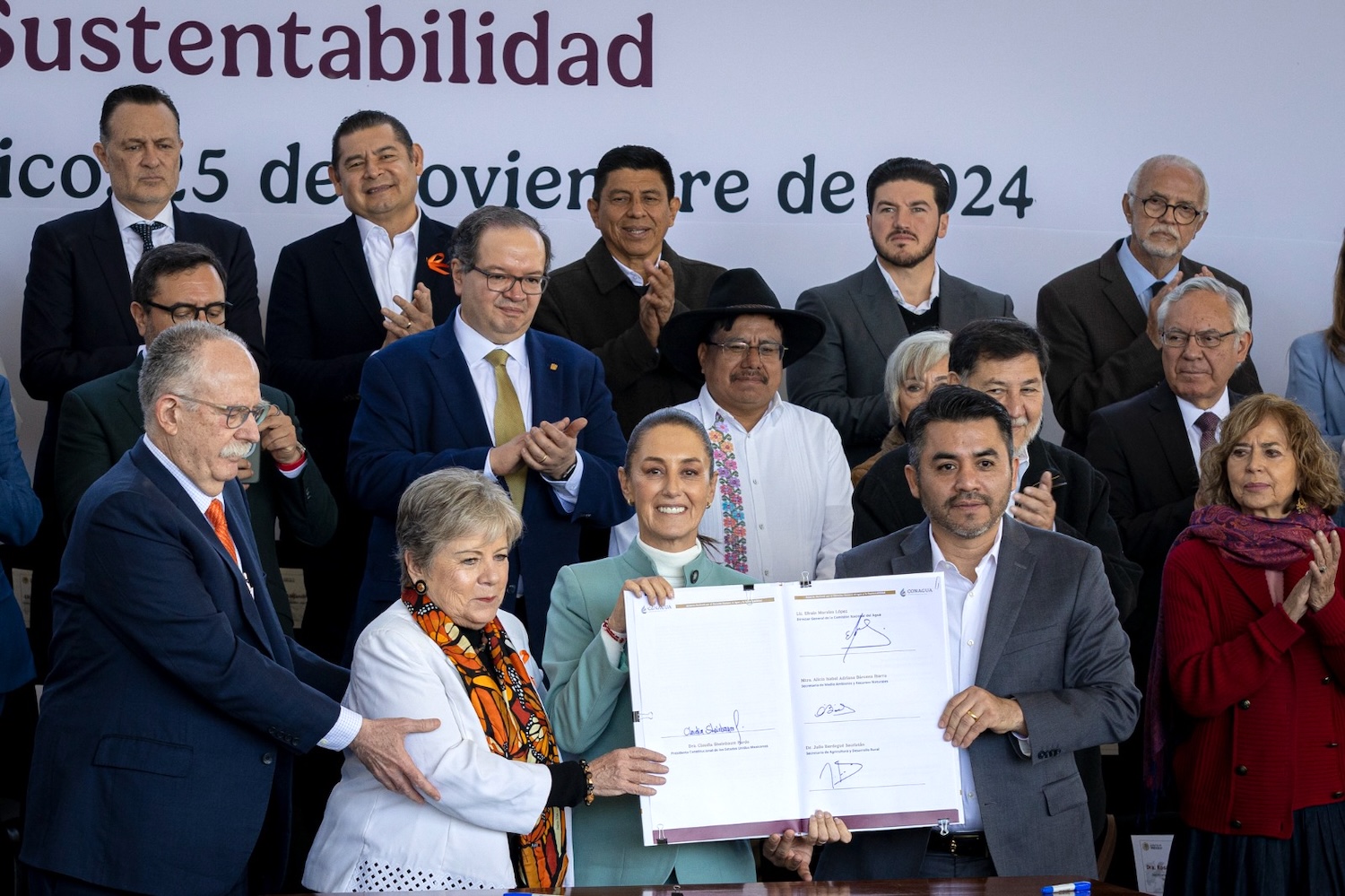Durante este acto, la presidenta de México, Claudia Sheinbaum Pardo, reconoció la suma de voluntades de las autoridades de las 32 entidades federativas, empresarios y representantes de sectores productivos y académicos, quienes se han unido para que cada mexicano tenga acceso al agua potable de calidad, con suficiencia, y que permita garantizar el abasto de este recurso para la producción de alimentos y el desarrollo del país en el largo plazo.
