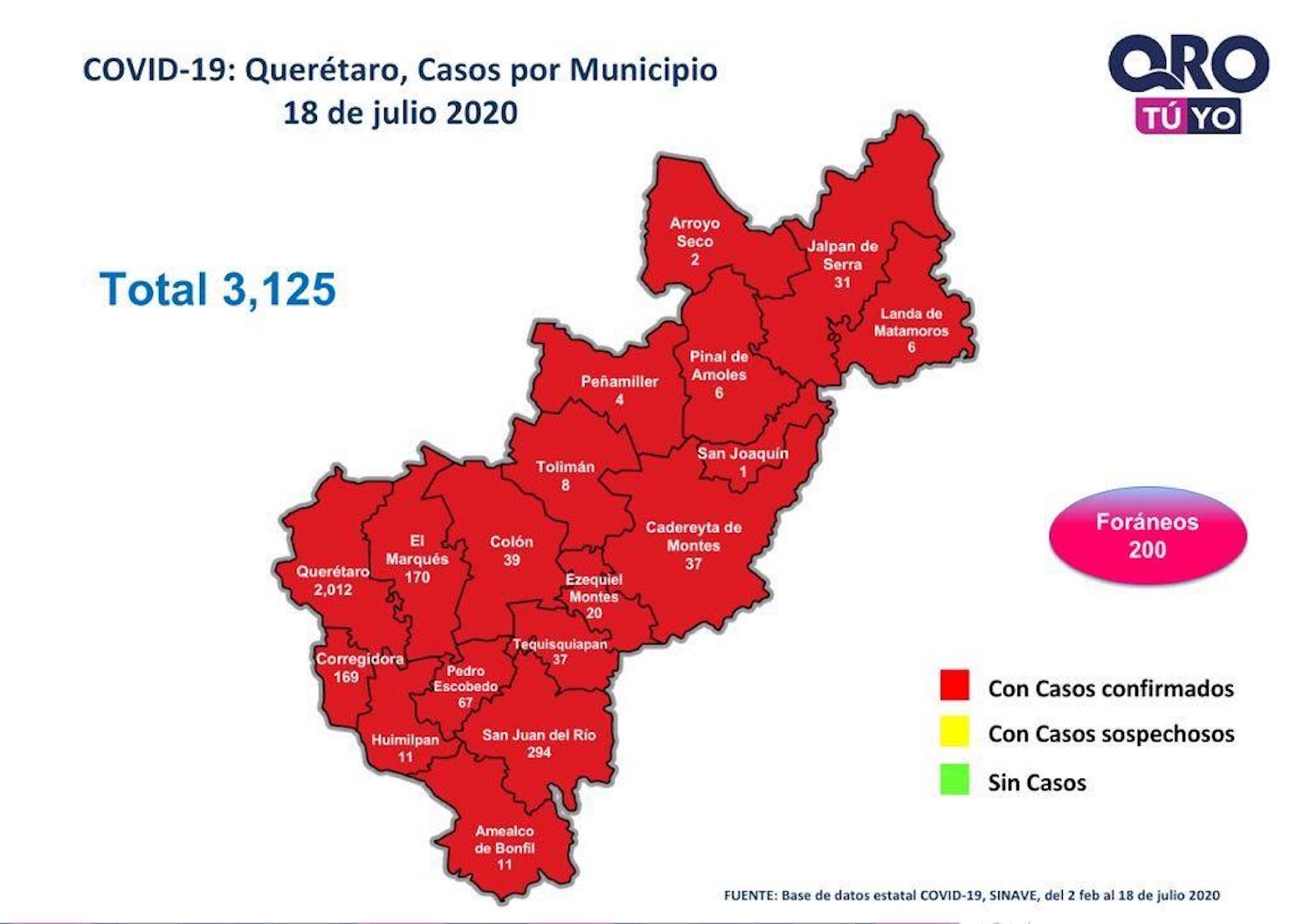 <blockquote class=”twitter-tweet”><p lang=”es” dir=”ltr”>Querétaro con 3,125 casos de <a href=”https://twitter.com/hashtag/COVID19?src=hash&ref_src=twsrc%5Etfw”>#COVID19</a><br><br>2,186 altas. Con sintomatología leve 331 pacientes y 24 en la Unidad Médica y de Aislamiento COVID-19. Hay 166 pacientes hospitalizados de los cuales 75 se encuentran graves. Se han registrado 418 defunciones. <a href=”https://twitter.com/hashtag/MeInformoYMeCuido?src=hash&ref_src=twsrc%5Etfw”>#MeInformoYMeCuido</a> <a href=”https://t.co/dZ94UEJ7ip”>pic.twitter.com/dZ94UEJ7ip</a></p>— SSalud Queretaro (@SSalud_Qro) <a href=”https://twitter.com/SSalud_Qro/status/1284678209162878976?ref_src=twsrc%5Etfw”>July 19, 2020</a></blockquote> <script async src=”https://platform.twitter.com/widgets.js” charset=”utf-8″></script>