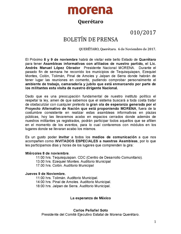 A la gira del dirigente nacional de Morena, Andrés Manuel López Obrador, el 8 y 9 de noviembre no podrá acudir la ciudadanía en general, sino que será a puertas cerradas solo para militantes o para quienes se afilien al momento a dicho partido, informó en comunicado el dirigente estatal, Carlos Peñafiel Soto.