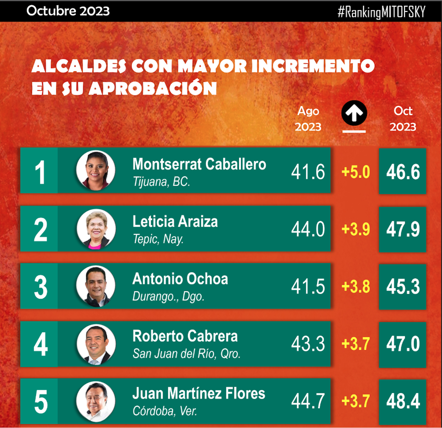 Con esto, el alcalde sanjuanense incrementó su aprobación en 3.7% respecto a la anterior medición, ubicándose a su vez en el cuarto alcalde con mayor incremento en su aprobación.
