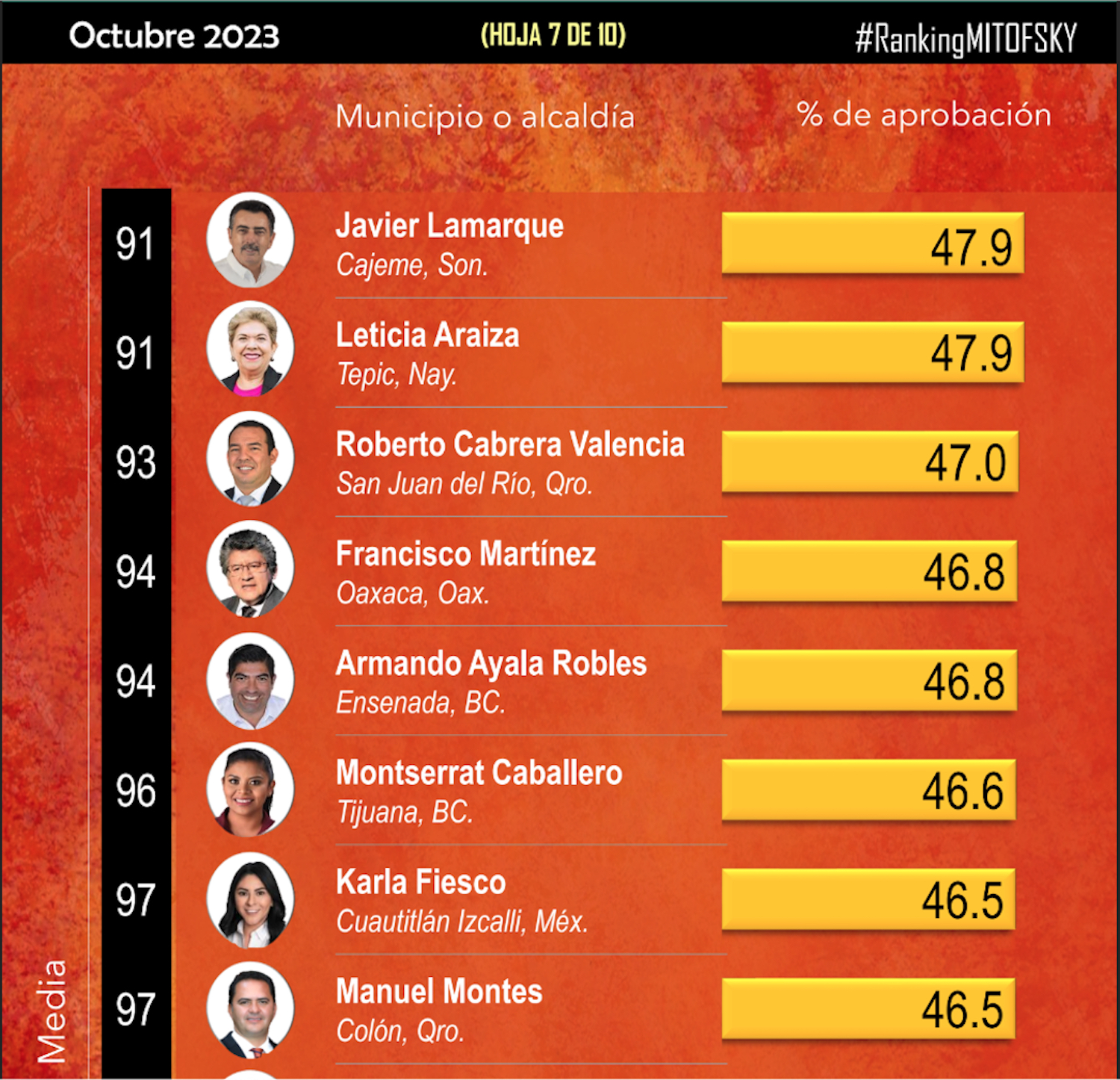 De acuerdo con “Ranking MITOFSKY: 150 Alcaldes y alcaldesas de México, octubre 2023”, el presidente municipal de San Juan del Río, Roberto Cabrera Valencia, se ubicó en el lugar 93 con una aprobación ciudadana de 47 por ciento.