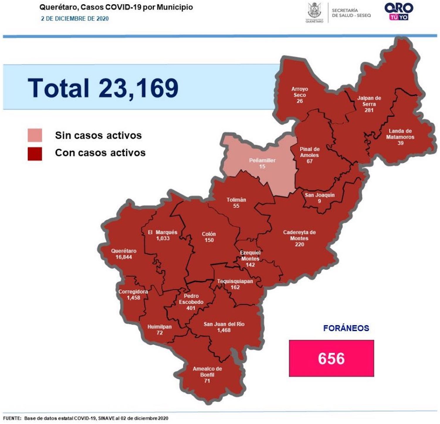 En Querétaro, una mujer de 61 años con diabetes, hipertensión arterial y obesidad, una mujer de 64 con hipertensión arterial, una mujer de 66 sin comorbilidad y una más de 75 años con diabetes e hipertensión arterial, que se encontraban hospitalizados, fallecieron a causa de Covid-19.