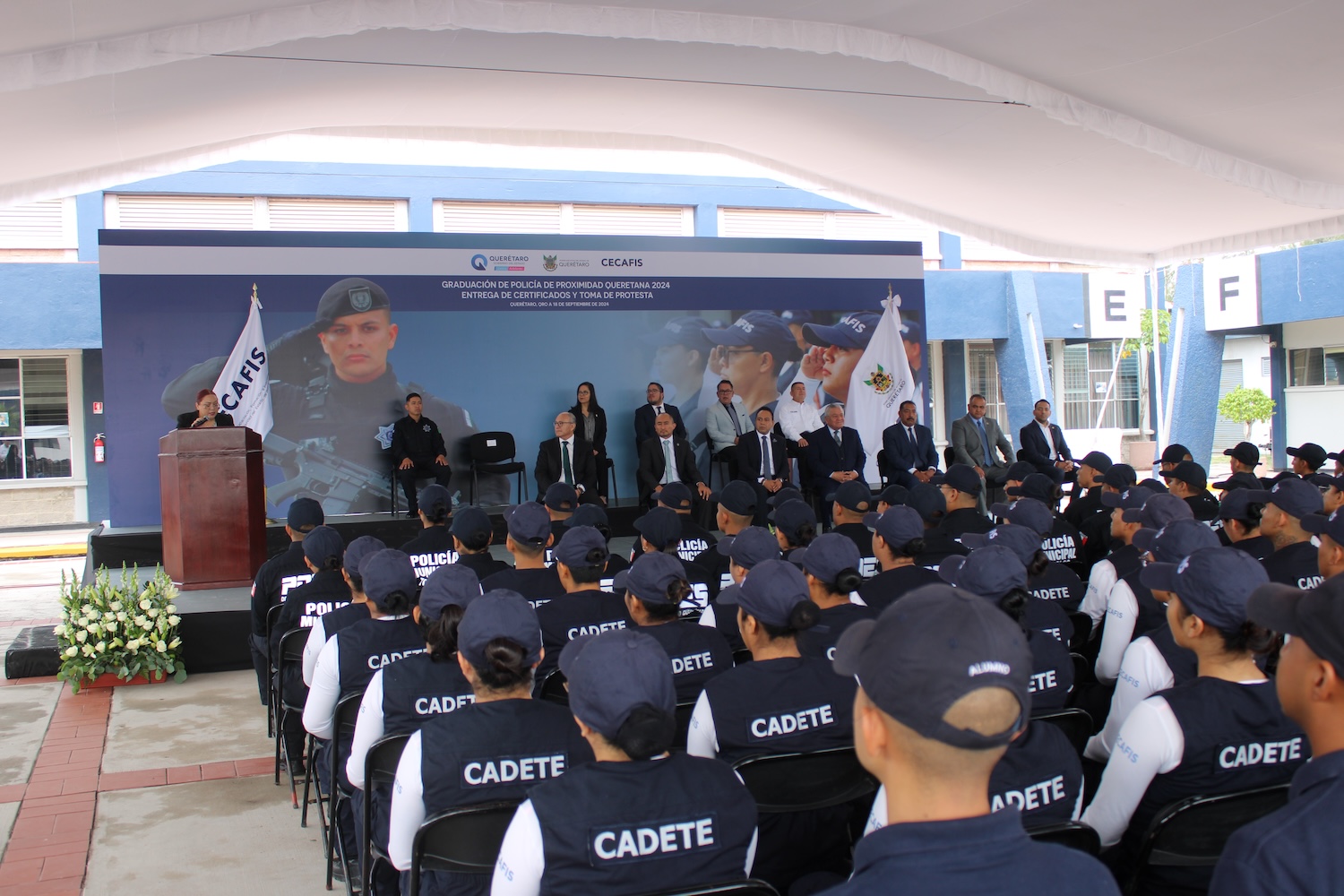 En el marco del 34º Aniversario del Centro de Capacitación, Formación e Investigación para la Seguridad (Cecafis), se llevó a cabo la ceremonia de graduación de 34 policías del Curso de Formación Inicial para Policía de Proximidad, quienes se suman al Estado de Fuerza de la policía queretana luego de mostrar que cuentan con los conocimientos, competencias y habilidades para desempeñar su función como policías de las tres justicias.