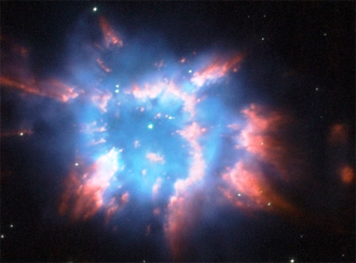 Añadió que los tonos azules y rojos apreciables en la imagen provienen de material que incluye oxígeno ionizado e hidrógeno que brilla bajo la acción de la alta radiación ultravioleta de la estrella central aún caliente.